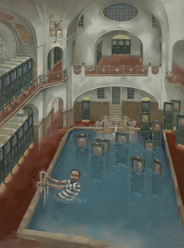Catedrala protestantă Lukaskirche este construită pe malul râului Isar. Chiar în această zonă râul deviază parțial spre dreapta printr-un mic baraj. Se formează astfel o zonă cu ape puțin adânci folosită de localnici pentru plajă. Plaja este simbolizată în lucrare prin șezlong și umbrelă. Barajul este reprezentat cu piese de mobilier din biserică.