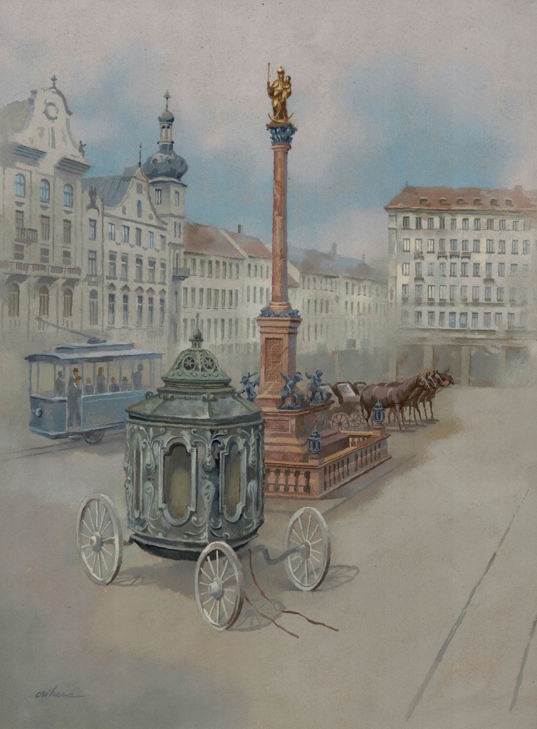 Marienplatz este piața centrală din München începând cu 1158. Aici se făcea comerțul cu grâne și tot aici aveau loc unele turnee(sau execuții publice). Denumirea a luat-o în 1854. În 1638 Electorul Maximilian a ridicat compoziția sculpturală Mariensäule – ca recunoștință pentru protejarea orașului de către ocupația suedeză – Războiul de 30 de ani. Bavarezii au considerat-o un afront. Regele suedez Gustav II Adolf a fost solidar cu populația. Compozitia este dedicată Sfintei Marii dar conține și simboluri militare. Pe colțurile gardului cu contur pătrat sunt patru frumoase felinare din fontă. Am reprezentat acest felinar drept caroserie pentru o trasură pentru că piața a fost de-a lungul timpului stație de tramvaie și de trăsuri.