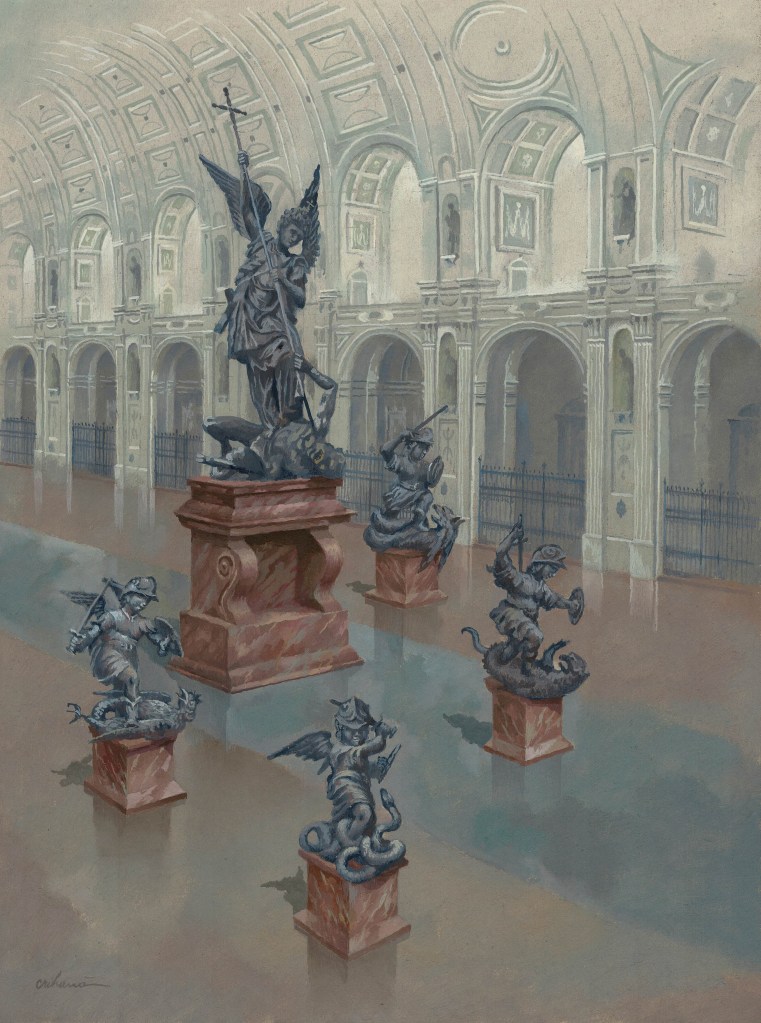 Sculptura lui St. Michael de la intrarea în biserică este din fontă pe postament de marmură roșie. La fel sunt și micii luptători din compoziția sculpturală Mariensaule (tot din fontă pe marmură roșie) din piața principală a orașului. Am folosit acest detaliu pentru a crea o imagine “München” și poate o ușoară mirare.