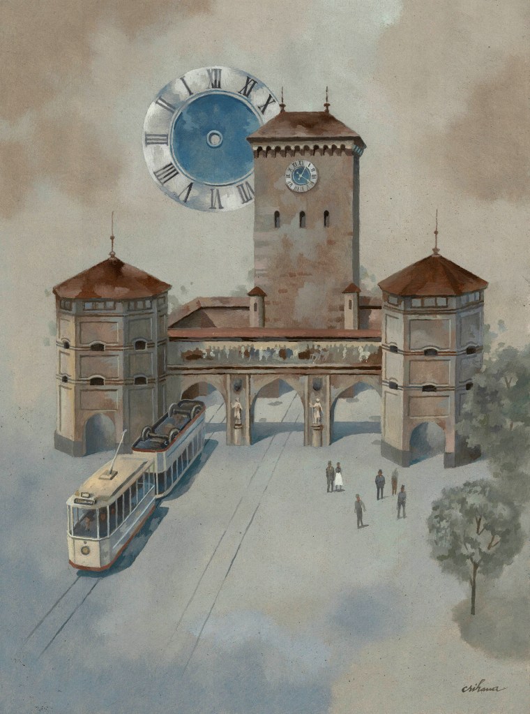 Isartor din München este una dintre cele patru porți principale ale zidului orașului medieval. A servit drept fortificație pentru apărare și este cea mai estică dintre cele trei porți gotice ale orașului München. Poarta este situată aproape de Isar și a primit numele râului. Germanii au montat pe peretele de nord al porții un ceas cu orele dispuse în sens invers. Mi-am permis și eu să desenez remorca tramvaiului tot invers.