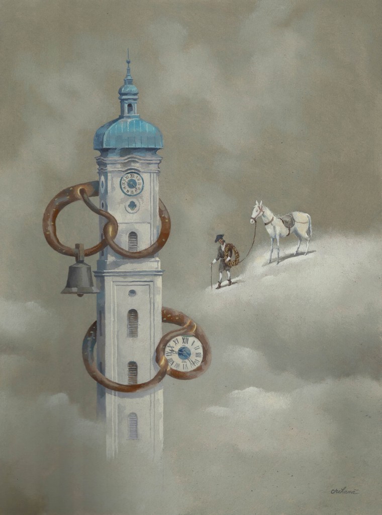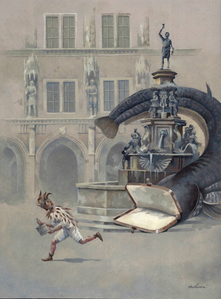 În pictură apare turnul bisericii Heilig Geist. Odată pe an de aici pornea noaptea un călăreț – cal alb – care împărțea covrigi în oraș. Era de fapt o donație de hrană pentru săraci. Covrigii putea fi ridicați și din biserică până a doua zi la prânz. Dar într-un an călărețul a terminat covrigii mult prea devreme și mulțimea l-a trântit la pământ și la bătut.