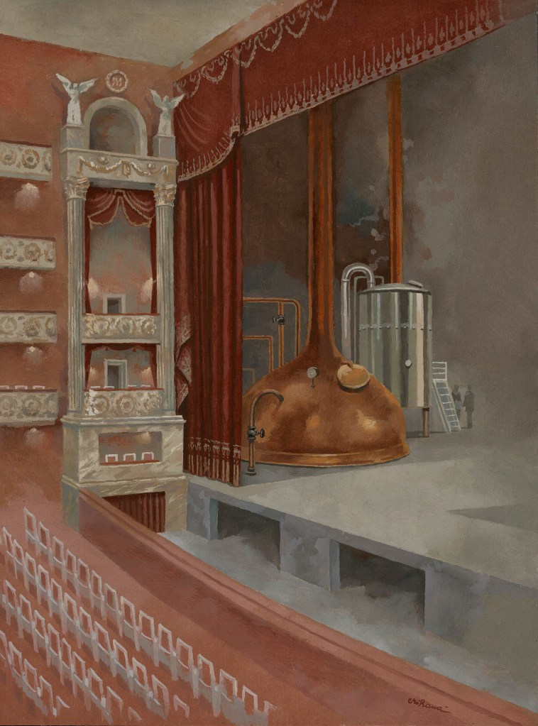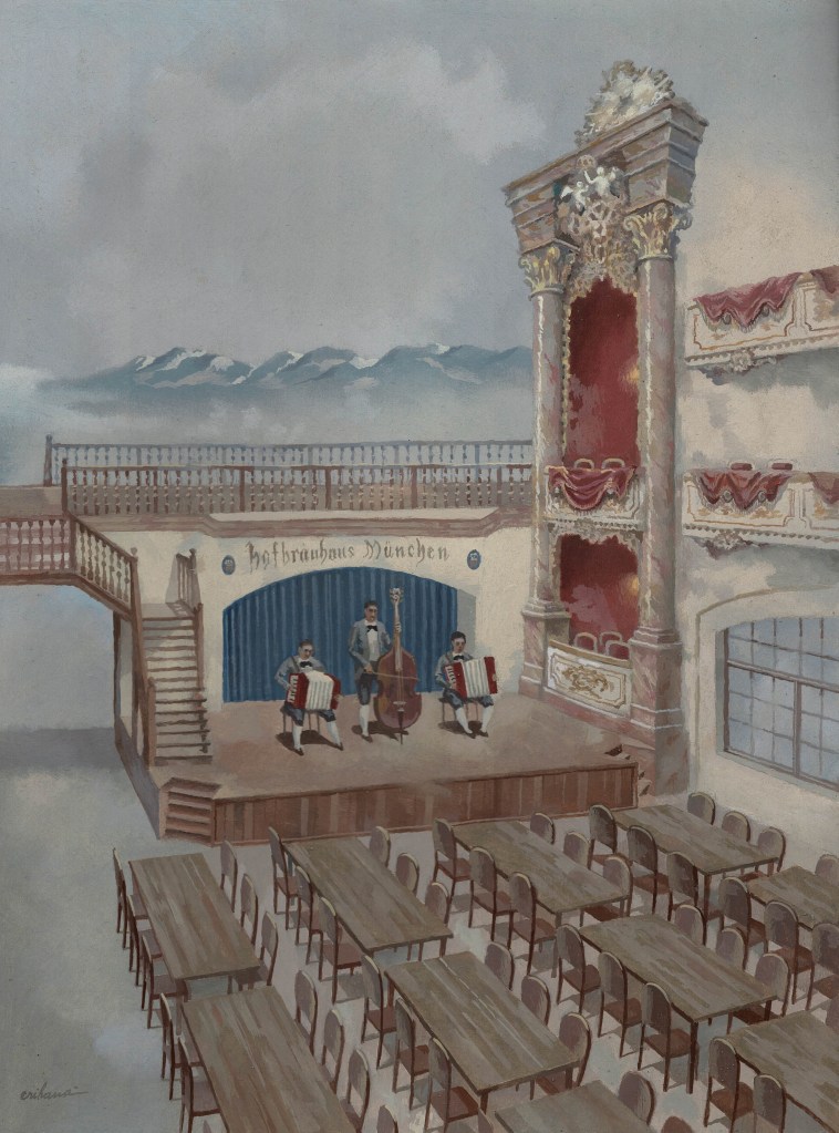 Pictura este o combinație între interiorul Casei Berii din Munchen și frumosul Cuvilliés-Theater. Lucrarea este ironică, din balcoanele elegante ale teatrului se poate urmări orchestra de trei instrumentiști și se poate asculta muzică de petrecere.
