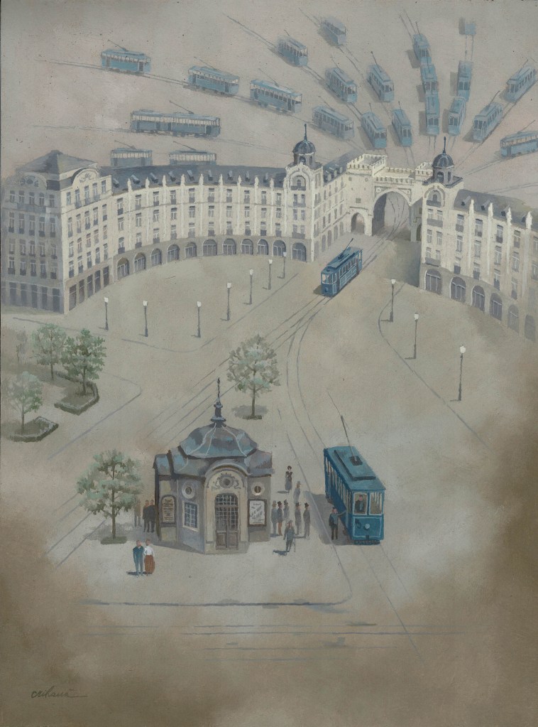 Pictura este o vedere simplificată a pieței Karlsplatz(elector) – localnicii preferă numele Stachus(han-berărie). Tramvaiele își asteaptă rândul la poartă să umple piața de viață. Piața a fost cândva cea mai circulată intersecție din Europa.