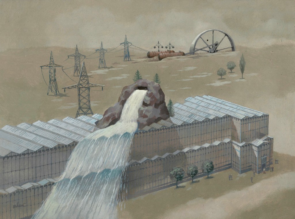 Compoziția este o sinteză a elementelor instalației de producere și transport a energiei electrice la distanță 1882. A fost primul transport de energie electrică din lume. Experimentul demondtrativ a fost realizat de fizicienii Oskar von Miller – Germania și Marcel Deprez – Franța. Curentul a fost produs de un motor cu aburi la Miesbach și transmis pe 60km la Glaspalast în Munchen. Ilustrarea experimentului a fost o bună ocazie de a reconstitui un transon de capăt al Palatului de sticlă.