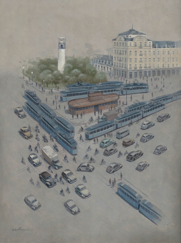 Pictura prezintă marea intersecție a pieței Stachus – Karlsplatz – anii de după cel de-al doilea război mondial. Era cea mai aglomerată intersecție a Europei. Aici predomină tramvaiele cu trei cabine și autoturismele – în majoritate Volkswagen.
