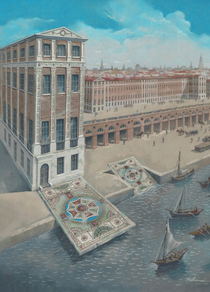 Adelphi houses were beautifully decorated not only on the outside but also on the inside. In the work you can see an example of the pavement, one of the ones I found in the books – it was probably in the entrance hall. I represented it outside the building so it could be seen.