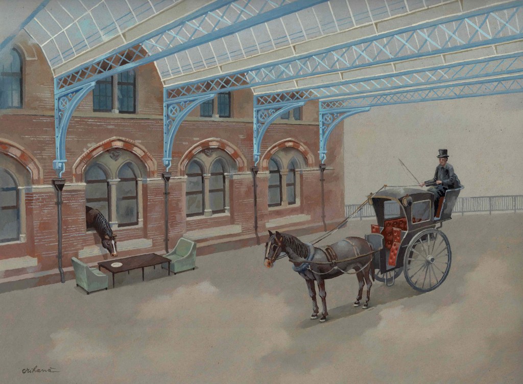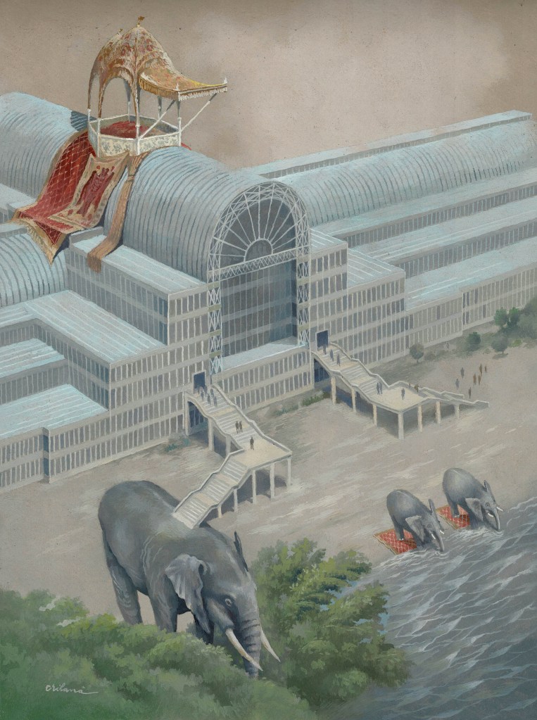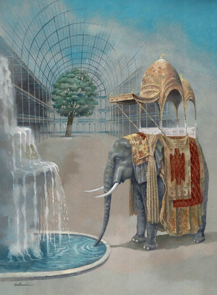 The elephant was purchased and blown from the Grand International Exhibition, London 1851. There it was part of the West Indies booth – it was a buttonhole. The old lithographs executed after the illustration of John McNevin are splendid. McNevin was an American illustrator. My elephant appears in the first painting of the London series inside the Crystal Palace. In that painting, I used the story to show the constructive details of the interior. The new variant represents the second building of the Crystal Palace, that of the Sydenham Hill, which was more imposing than the first. The elephant returned with two children. At the highest point of the palace, elephants parked an incredibly rich Indian-style booth. I used the stage to clearly render the structure of the building seen from the outside, thousands of glass pieces arranged on uniform metal frames.