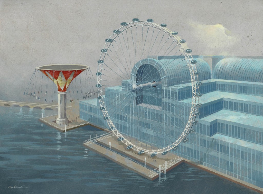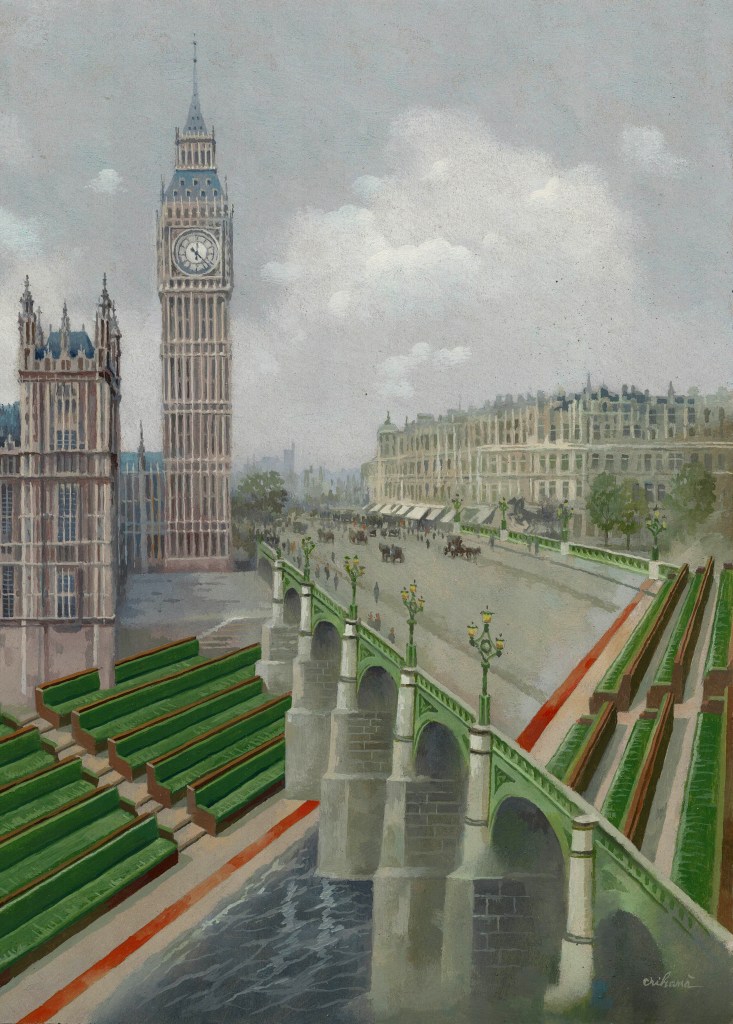 The bridge is cast iron and traditionally painted in the color of the leather benches in the House of Commons. I staged these banks down to the water of the Thames. Naturally, I also brought the second section of benches. On the bridge is the Power, under the bridge – the Opposition, which can start “digging”. The bridge is supposed to unite politicians, but it runs diagonally as a zone of separation. Red stripes are drawn in the House of Commons to prevent physical aggression between politicians. The Big Ben tower and a corner body from the monumental Parliament building that stretches along the river also appear in the picture.