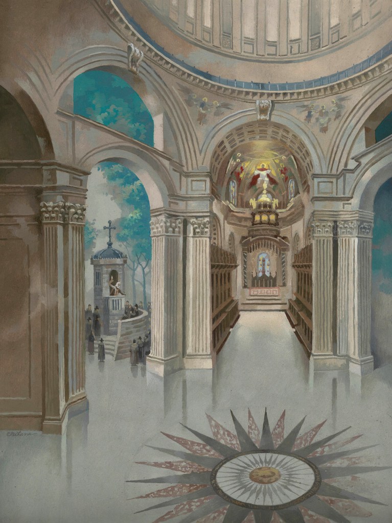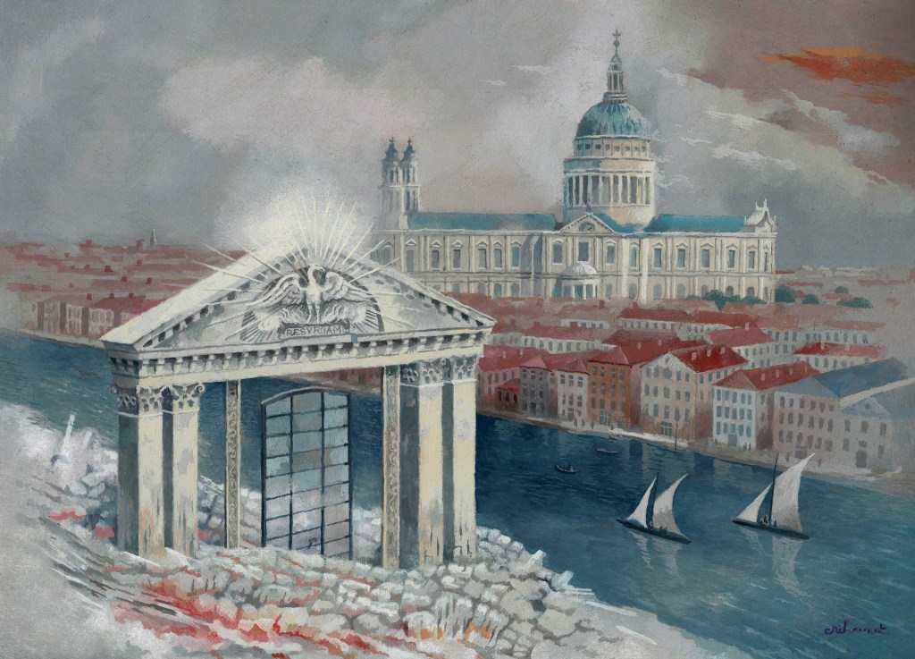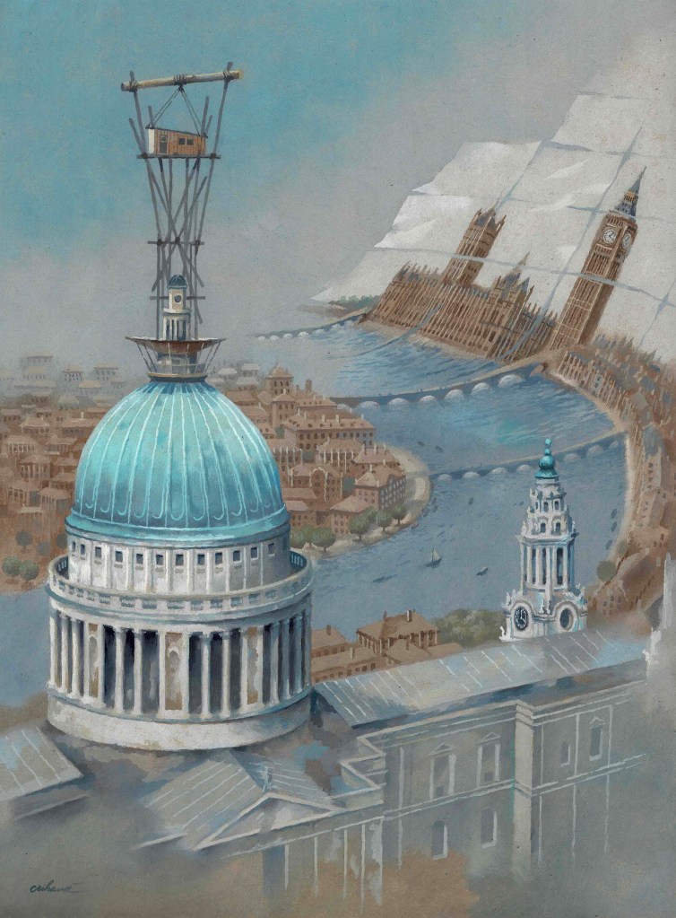 In 1821 the artist Thomas Hornor built a temporary cottage on the dome of St Paul’s Cathedral in London. The cross and globe on the dome were in the process of being replaced. He made panoramic drawings with the aim of multiplying and selling them. He didn’t sell anything, but what happened next would be worth evoking in a new painting from me.