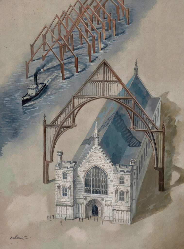 The great roof of Westminster Hall is the largest medieval timber roof in Northern Europe. It houses 13 oak hammer beams, weighing around 660 tonnes, which were mostly fabricated off-site and transported to Westminster by barges and horse-drawn wagons for assembly. The work was largely undertaken by the king’s chief mason, Henry Yevele, and carpenter Hugh Herland. Yevele had been involved in almost all the major building projects of the late 14th century, such as the Tower of London, Westminster Abbey and Canterbury Cathedral. He also built the Jewel Tower in 1365-66. To highlight the beam, the artist moved it outside the building.