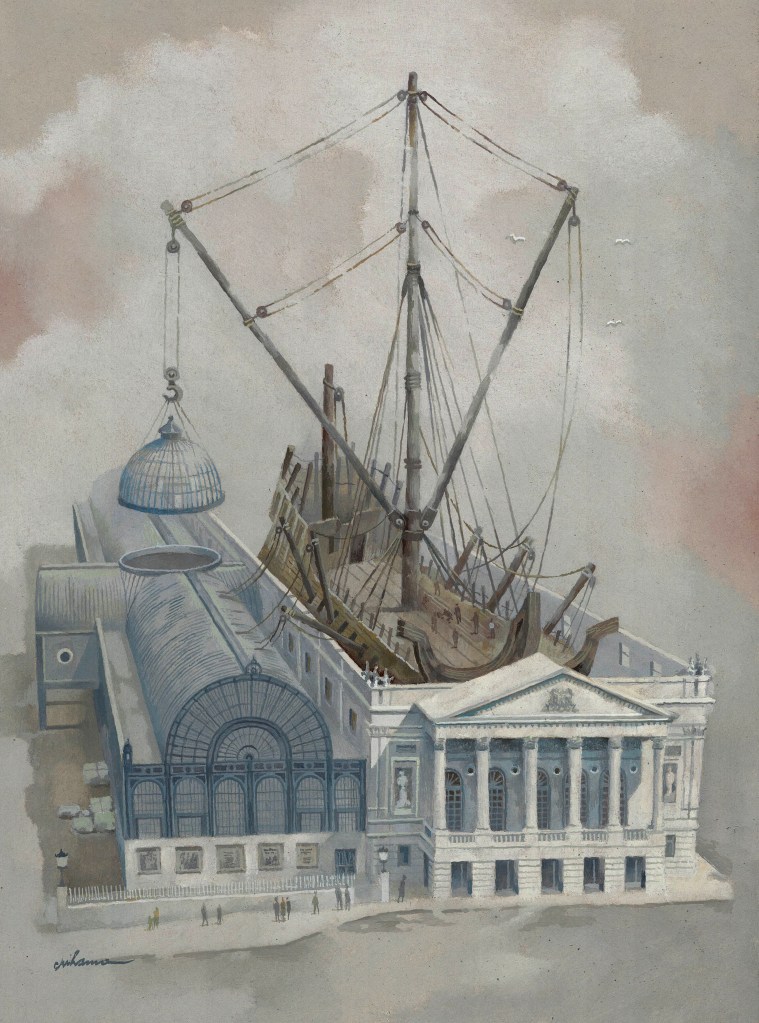 The artist saw the shape of the Royal Opera House building as similar to a dock in Deptford Dockyard. As a result, he brought a crane called Sheer Hulk into the space between the side walls. The cranes were obtained by decommissioning decommissioned ships. They were rudimentarily but solidly fitted with a central structure and arms for pulley work. Such refits of old ships were done to obtain barracks, dormitories for workers or penitentiaries. The position of the crane’s mast suggested to the artist the hooking of the dome of Covent Garden. A link was thus created between the two sister buildings. In the painting, an older version of the greenhouse facade is represented, with showcases for show posters.