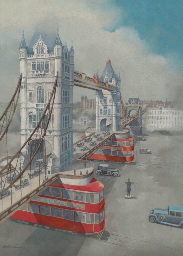 The two foundations of Tower Bridge have a similar geometric shape to the double-decker trams that once ran through London. It was an observation that I used in the finished painting. Thus, a wide thoroughfare was formed under the bridge, in which there is also a policeman from the Road Traffic department. The composition was completed with some vintage cars and even the Tower of London – visible from this angle among the towers. The suspension system of the bridge is colored chocolate-brown, the original color.