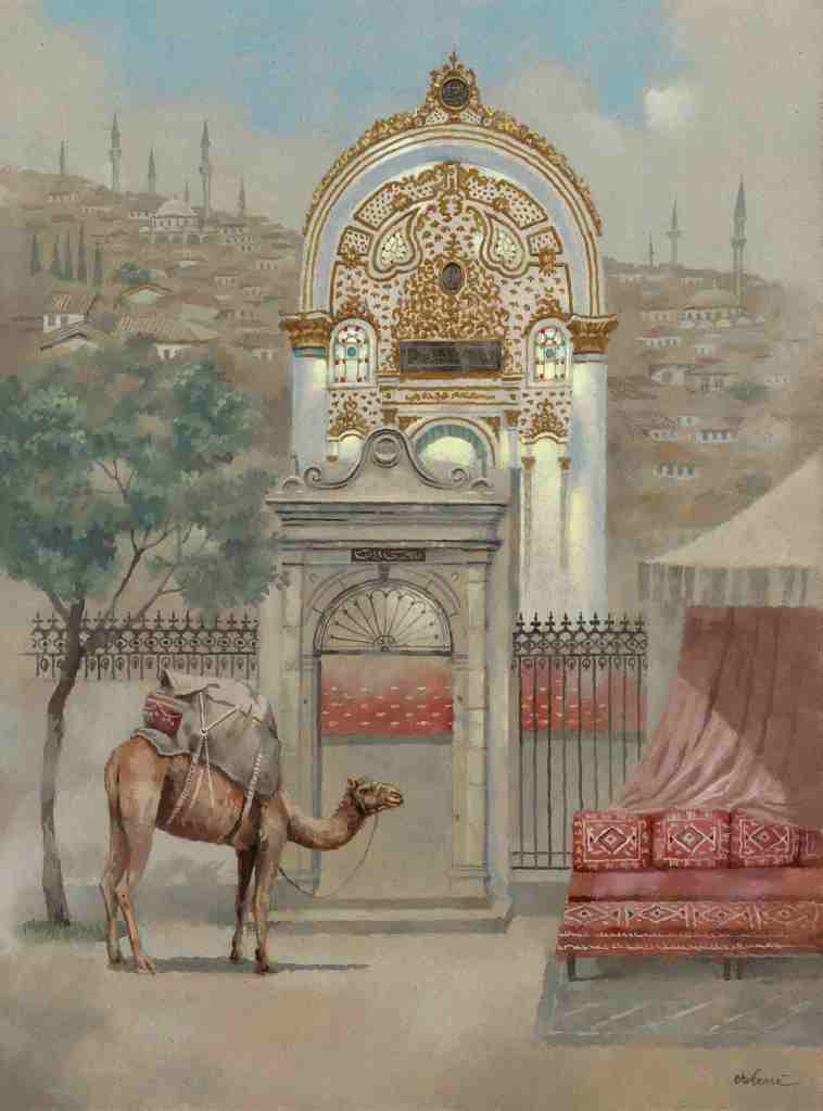 Around this central structure, Crihană introduces elements of urban life: the camel (documented in historical photographs of the old bazaar) and the ornamental carpet (evoking the commercial world of Kemeraltı and the decorative traditions associated with Islamic space). The background adds another layer through the silhouettes of mosques and minarets fading into the urban landscape. The work functions as an imagined reconstruction of a fragment of Izmir, where the city is condensed into a constellation of signs evoking architecture, commerce, and the sacred dimension of place.