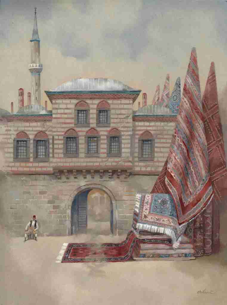 In “Kızlarağası Hanı,” the composition is structured around a clear relationship between the architectural framework and the intervention of decorative objects. The façade of the caravanserai—an inn designed for merchants and caravans—and the compact volume of the building establish a recognizable setting grounded in documented reality. The intervention emerges through an ensemble of carpets, traditional textiles used both as everyday objects and as goods of exchange. Removed from the logic of commercial display and rearranged, layered, and elevated into near-vertical forms, they create a visual mass that dominates the image.