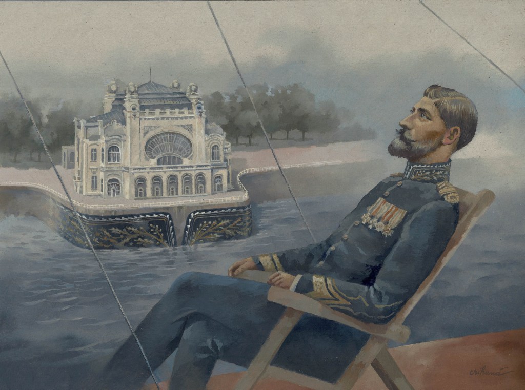 Principele a reprezentat familia regală la inaugurarea cazinoului. El este reprezentat aici într-o poziție relaxată, așa cum ar trebui o persoană să fie pe litoralul românesc. Artistul face aluzie și la fregata Regele Ferdinand.