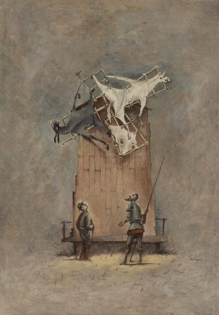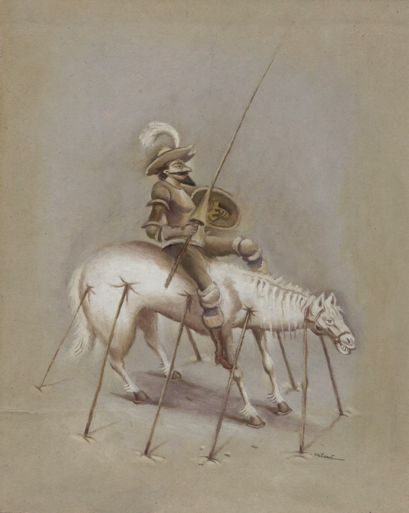 Diese scheinbare Vereinnahmung wird möglich, weil Don Quijote und Sancho Pansa mit ihren sich wiederholenden Attributen und Symbolen zu einem festen Bildtopos avancierten, auf diese Weise wiedererkennbar wie die Heiligen in der mittelalterlichen Kunst und wieder verwendbar, wenn ein Thema es erfordert. Das gilt nicht nur für die Illustration und Karikatur, sondern auch für die Malerei, Zeichnung und Skulptur, ja selbst für die Masssenartikel und Souvenirs in den Touristikzentren Spaniens. Der Don Quijote von Cervantes ist nach der Bibel das am meisten übersetzte und illustrierte Werk der Weltliteratur. Und um in einem solch umfassenden Kosmos aus Text, Bild und Objekt, der in Jahrhunderten gewachsen ist, eine individuelle Aussage zu artikulieren, bedarf es einer gehörigen Portion an Phantasie und künstlerischem Vermögen. Florian Doru Crihana hat beides und hat in seinem großen Zyklus, der in der Sammlung Burkamp fast vollständig enthalten ist, die wunderbaren Abenteuer des Don Quijote um abenteuerliche Bildfolgen voller Wunder erweitert.