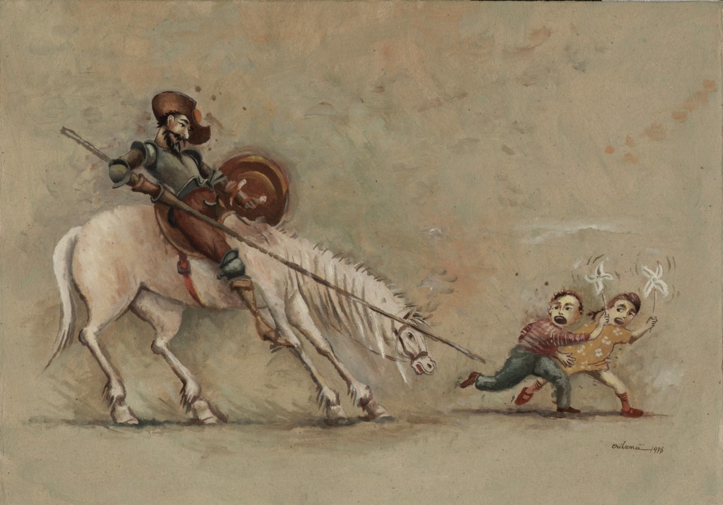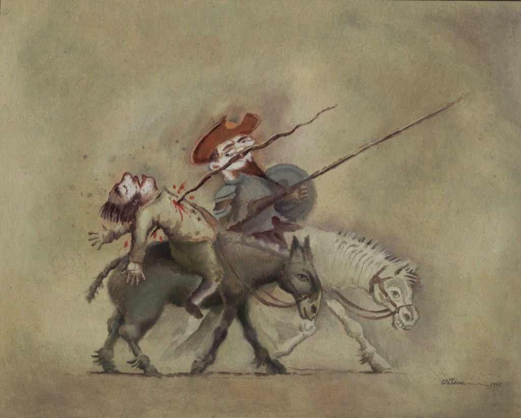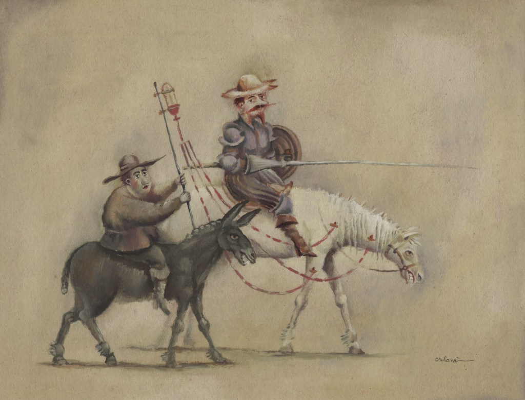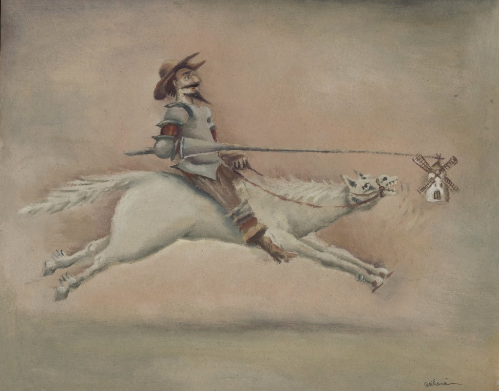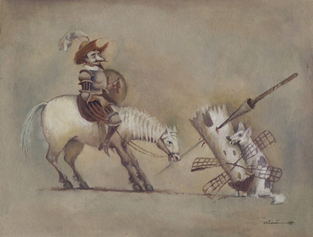 Am Ende aller Abenteuer macht Miguel de Cervantes aus seinem gar nicht so törichten, vielmehr weitsichtig denkenden Sancho Pansa einen Propheten. Längst hat ihn die Wirklichkeit bestätigt und gar überholt. Die Darstellungen von Don Quijote sind Legion, mehr noch, das Bild des Ritters von der traurigen Gestalt auf dem Klepper Rosinante mit seinem behäbigen Knappen Sancho Pansa auf dem Esel hat sich verselbständigt. Der Künstler Florian Doru Crihana hat die literarische Fiktion in einem großen Werkzyklus verbildlicht, hat ihm unverwechselbare Gestalt gegeben, wobei das Wort „unverwechselbar“ doppelt zutrifft. Zum einen bedient er die gängigen Klischees und appelliert augenzwinkernd an die Mitwisserschaft des Betrachters, zum anderen bleibt er sich selbst treu. Dieser Schöpfer trügerischer Idyllen lässt in unendlich feinen Nuancen eine phantastische Farblandschaft erstehen, in der seine Personen agieren. Das Verblüffende dabei ist, dass Crihana sich zwar auf die wenigen bekannten Merkmale konzentriert, aber trotzdem an ihnen die ganze Fülle seiner Bildideen auszubreiten vermag. Hut, Bart, Rüstung über dünner, gelängter Figur und Pferd beim Don Quijote, daneben die rundliche Gestalt des Sancho Pansa auf dem Esel und – nicht zuletzt – die Windmühle. Das genügt. Und nun setzt die reiche Erfindungsgabe Crihanas ein, die mit den tradierten Motiven ganz neue Bilder zaubert, geistreiche Bilder, absurde Szenen, die in ihrer Tragikomik durchaus der Intention Cervantes’ auf der Spur bleiben. Ihr besonderer Reiz liegt nicht zuletzt darin, dass dieser Künstler seine subtilen Bildschöpfungen in einer Zone zwischen reiner Fiktion und vermeintlicher Wirklichkeit ansiedelt, etwa wenn die Attribute aus dem Alltag des Betrachters genommen werden ohne aber den literarischen Zusammenhang zu leugnen. Diese Balance ist ein wesentliches Merkmal der Kunst von Crihana, seine persönliche Handschrift, die ihn auszeichnet. Er überbrückt in einem dichten Farbgewebe, das keine lauten Töne und harten Konturen kennt, Zeiten und Orte. Ein modernes Baufahrzeug ist in diesem Kontext ebenso wahrhaftig wie eine Gondel oder ein Pferd. Die Selbstverständlichkeit des Unmöglichen macht den Reiz dieser Bildinterpretationen aus. Sie heben ihn hervor aus der Zahl der zeitgenössischen Künstler, die das Thema auch für sich entdeckten und räumen ihm eine Sonderstellung ein. Waren in den ersten Jahrhunderten seit Erscheinen des Romans 1605, Teil zwei 1615, literarische Vorlage und Verbildlichung des Wortes eng verbunden, wie es in der Natur der Illustration als eine dem Text dienende Veranschaulichung angelegt ist, so muss zeitgenössische Darstellung zu Beginn des dritten Jahrtausends nicht einmal mehr die Kenntnis dieses großen spanischen Beitrags zur Weltliteratur voraussetzen. Die Motivtradition hat das Sujet auf markante Themen verkürzt, durch die Jahrhunderte im Bildgedächtnis verankert und abrufbar gemacht als sprichwörtliche Binsenweisheiten. Das Bildwissen ist kein Bildungswissen mehr.