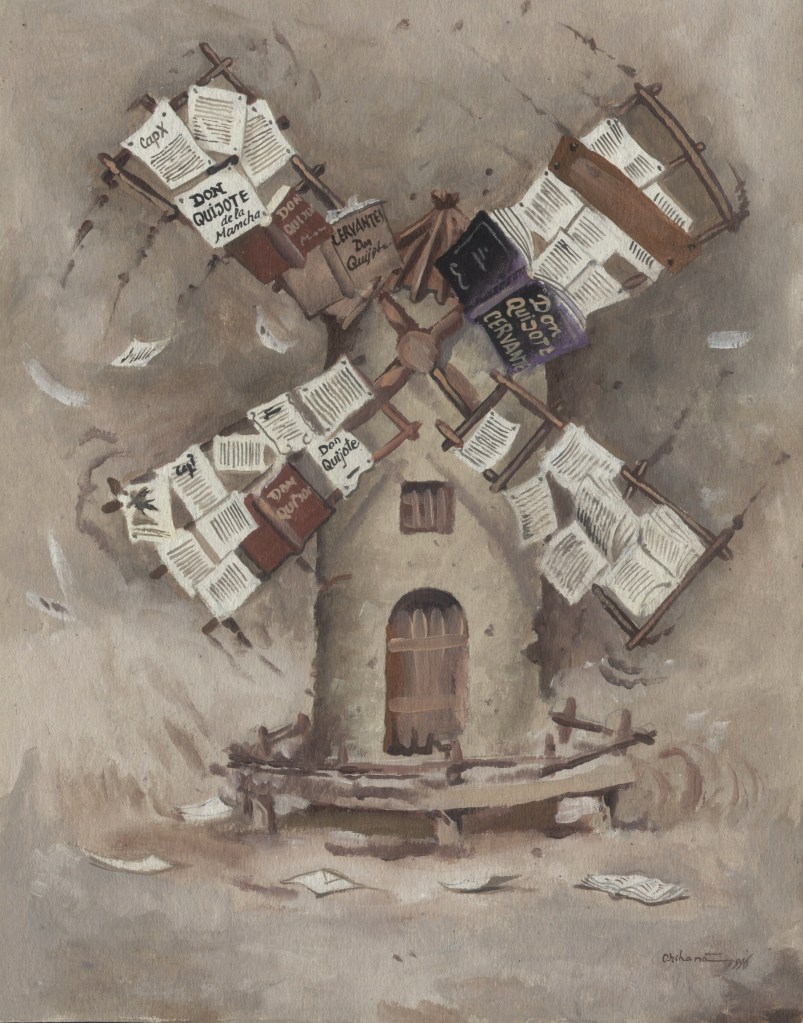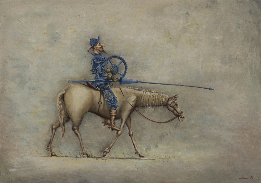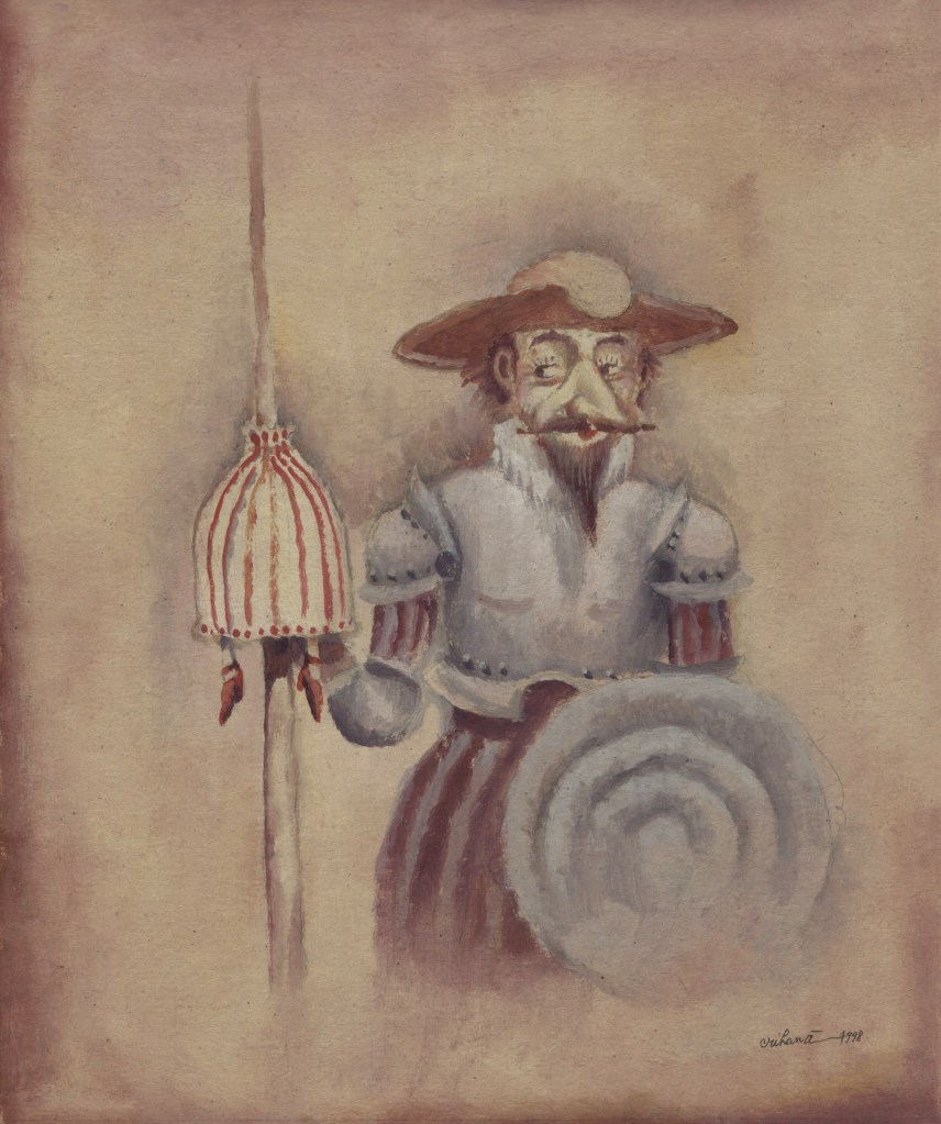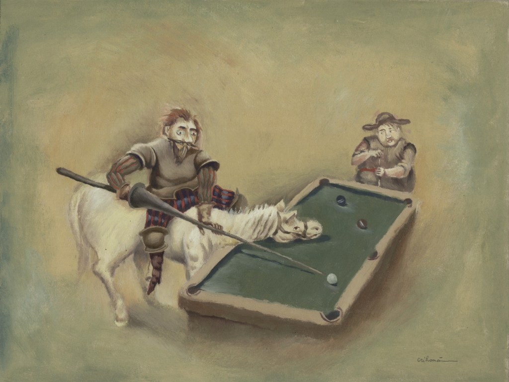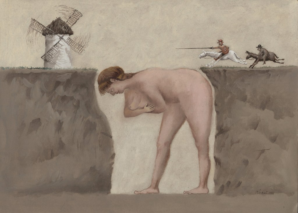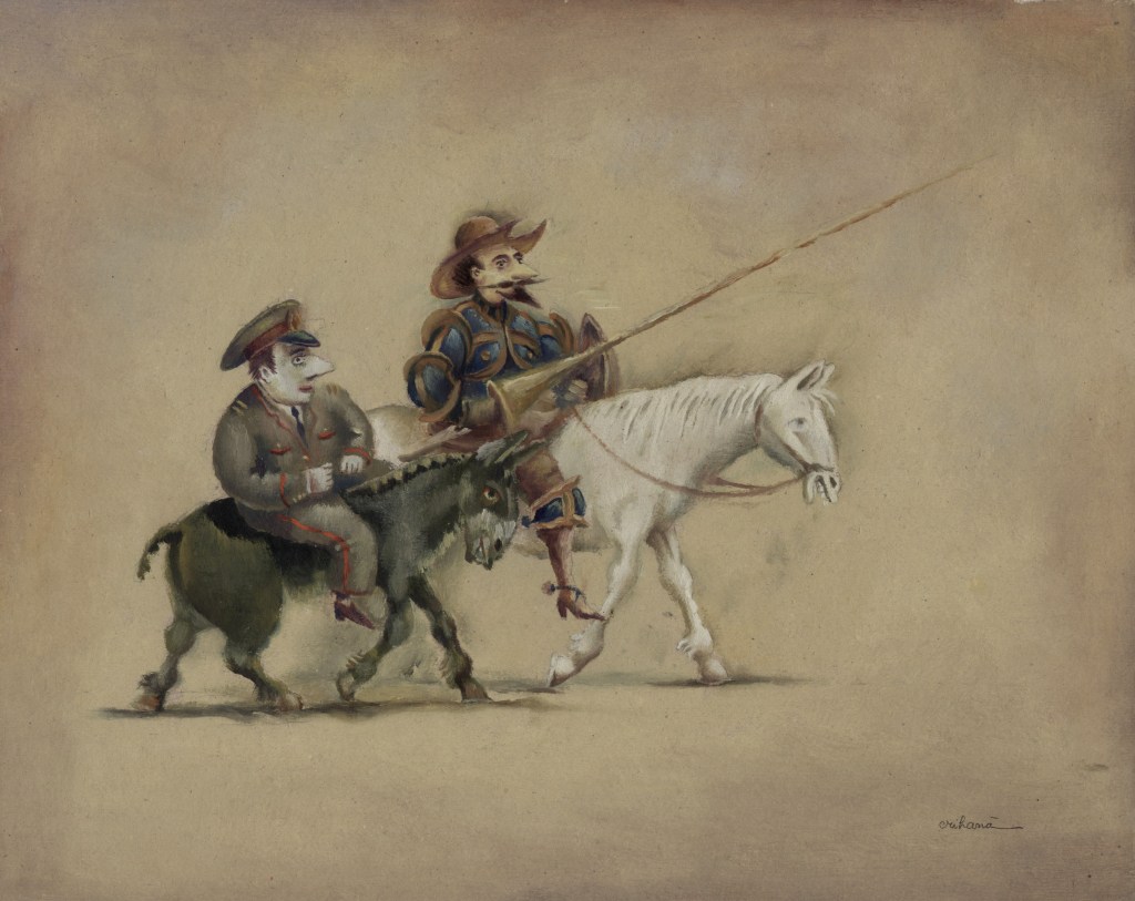 Am Ende aller Abenteuer macht Miguel de Cervantes aus seinem gar nicht so törichten, vielmehr weitsichtig denkenden Sancho Pansa einen Propheten. Längst hat ihn die Wirklichkeit bestätigt und gar überholt. Die Darstellungen von Don Quijote sind Legion, mehr noch, das Bild des Ritters von der traurigen Gestalt auf dem Klepper Rosinante mit seinem behäbigen Knappen Sancho Pansa auf dem Esel hat sich verselbständigt. Der Künstler Florian Doru Crihana hat die literarische Fiktion in einem großen Werkzyklus verbildlicht, hat ihm unverwechselbare Gestalt gegeben, wobei das Wort „unverwechselbar“ doppelt zutrifft. Zum einen bedient er die gängigen Klischees und appelliert augenzwinkernd an die Mitwisserschaft des Betrachters, zum anderen bleibt er sich selbst treu. Dieser Schöpfer trügerischer Idyllen lässt in unendlich feinen Nuancen eine phantastische Farblandschaft erstehen, in der seine Personen agieren. Das Verblüffende dabei ist, dass Crihana sich zwar auf die wenigen bekannten Merkmale konzentriert, aber trotzdem an ihnen die ganze Fülle seiner Bildideen auszubreiten vermag. Hut, Bart, Rüstung über dünner, gelängter Figur und Pferd beim Don Quijote, daneben die rundliche Gestalt des Sancho Pansa auf dem Esel und – nicht zuletzt – die Windmühle. Das genügt. Und nun setzt die reiche Erfindungsgabe Crihanas ein, die mit den tradierten Motiven ganz neue Bilder zaubert, geistreiche Bilder, absurde Szenen, die in ihrer Tragikomik durchaus der Intention Cervantes’ auf der Spur bleiben. Ihr besonderer Reiz liegt nicht zuletzt darin, dass dieser Künstler seine subtilen Bildschöpfungen in einer Zone zwischen reiner Fiktion und vermeintlicher Wirklichkeit ansiedelt, etwa wenn die Attribute aus dem Alltag des Betrachters genommen werden ohne aber den literarischen Zusammenhang zu leugnen. Diese Balance ist ein wesentliches Merkmal der Kunst von Crihana, seine persönliche Handschrift, die ihn auszeichnet. Er überbrückt in einem dichten Farbgewebe, das keine lauten Töne und harten Konturen kennt, Zeiten und Orte. Ein modernes Baufahrzeug ist in diesem Kontext ebenso wahrhaftig wie eine Gondel oder ein Pferd. Die Selbstverständlichkeit des Unmöglichen macht den Reiz dieser Bildinterpretationen aus. Sie heben ihn hervor aus der Zahl der zeitgenössischen Künstler, die das Thema auch für sich entdeckten und räumen ihm eine Sonderstellung ein. Waren in den ersten Jahrhunderten seit Erscheinen des Romans 1605, Teil zwei 1615, literarische Vorlage und Verbildlichung des Wortes eng verbunden, wie es in der Natur der Illustration als eine dem Text dienende Veranschaulichung angelegt ist, so muss zeitgenössische Darstellung zu Beginn des dritten Jahrtausends nicht einmal mehr die Kenntnis dieses großen spanischen Beitrags zur Weltliteratur voraussetzen. Die Motivtradition hat das Sujet auf markante Themen verkürzt, durch die Jahrhunderte im Bildgedächtnis verankert und abrufbar gemacht als sprichwörtliche Binsenweisheiten. Das Bildwissen ist kein Bildungswissen mehr.