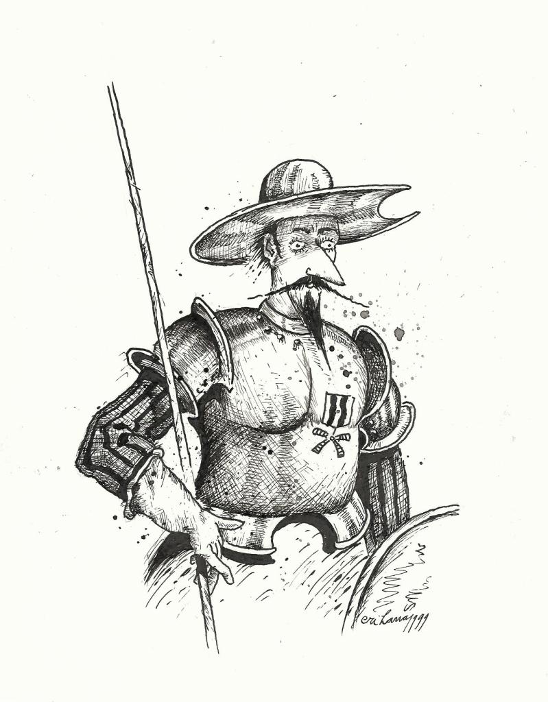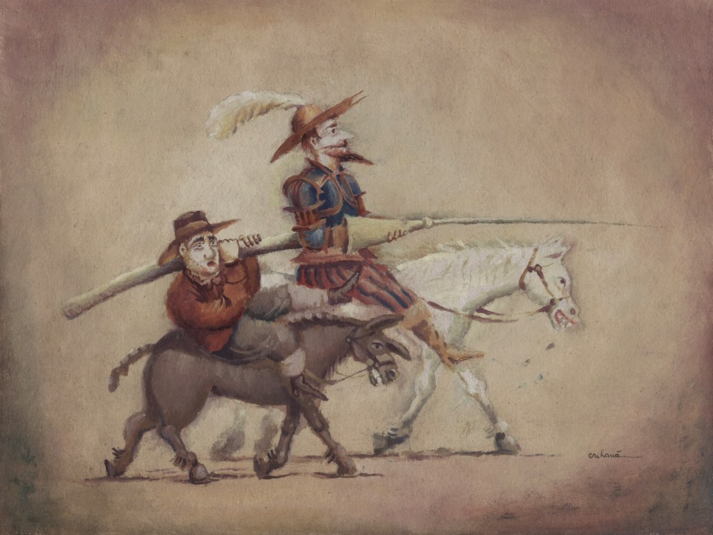 Don Quijote – so viel wird mit diesem Namen verknüpft – das ist die tragische Figur des Idealisten, der sich nahezu blindlings für das Wahre und Gute einsetzt und im Kampf gegen die Windmühlenflügel, die Bild gewordenen Tücken des Lebens, unterliegen muss. Und das ist auch schon das meist illustrierte Abenteuer aus der Vielzahl der ritterlichen Prüfungen, die der Edle von la Mancha zu überstehen hat. Und Sancho Pansa? Er ist der Pragmatiker, der die Ideale an der Chance des Überlebens misst. Wie wichtig und ohne Unterschied aber dem Autor beide Protagonisten waren, beweist die textkritische Untersuchung des Cervantes-Instituts von 1998. Exakt 2143 mal tauchen beide Namen im Roman auf.